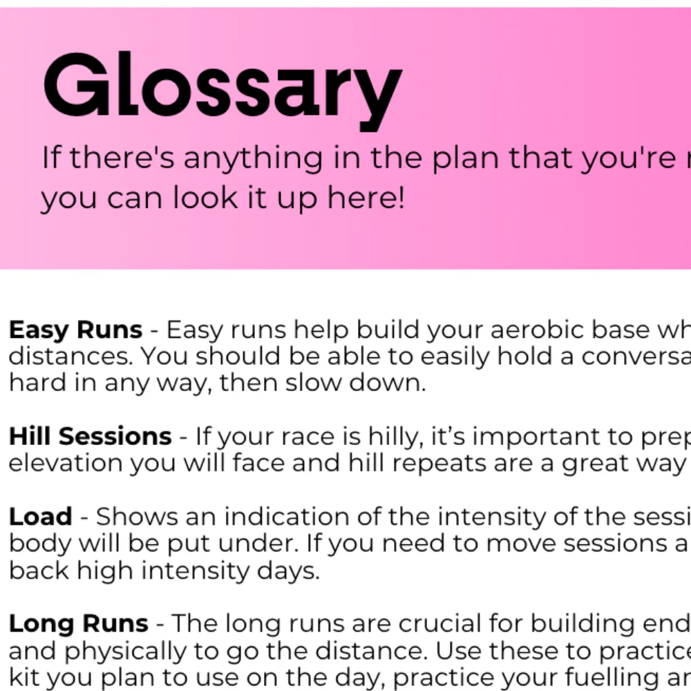 - Pace chart so you know exactly how fast your runs should be