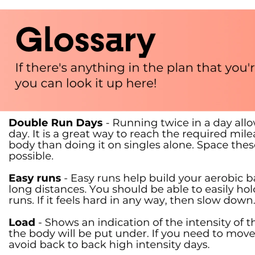 - Pace chart so you know exactly how fast your runs should be